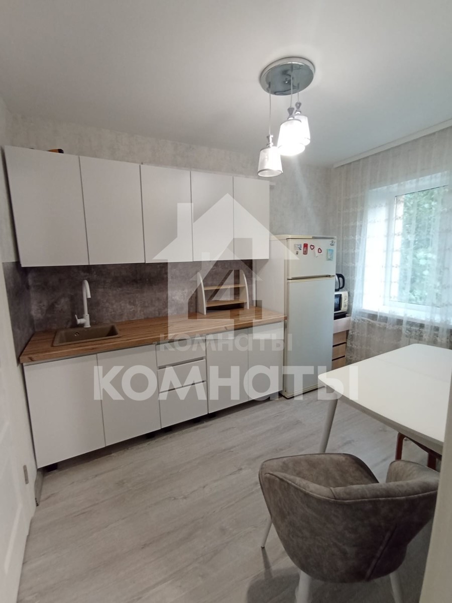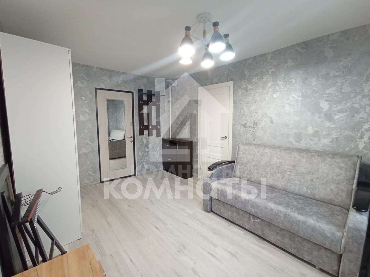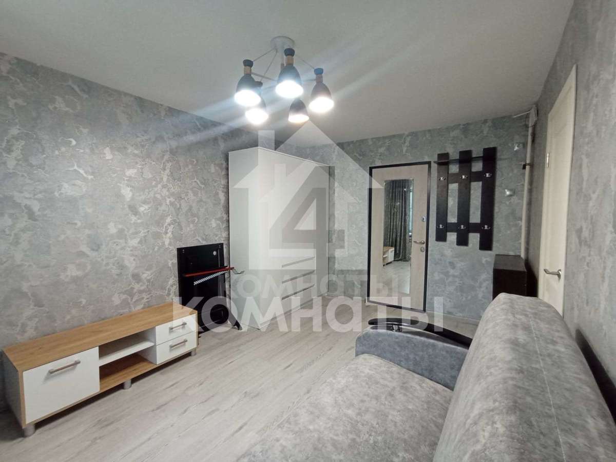 Квартира оснащена мебелью и техникой: кухонный гарнитур, холодильник, микроволновка; в комнате большой диван, шкаф, тумба под телевизор.