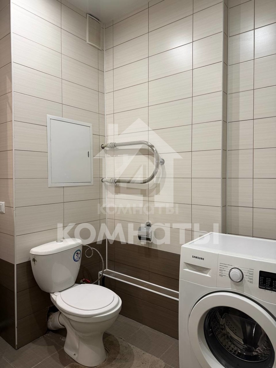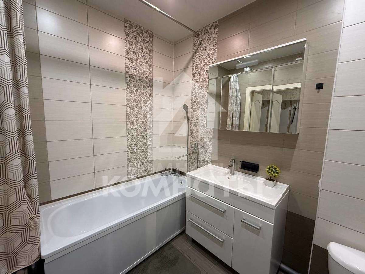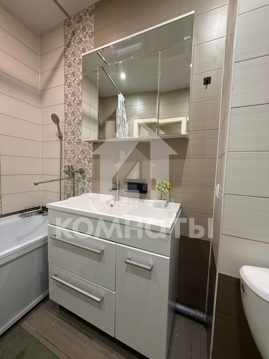 В кухне установлен функциональный кухонный гарнитур, который выполнен в современном стиле. Совмещенный санузел отделан плитной в приятных тонах, под раковиной установлена тумба и подвесное зеркало.