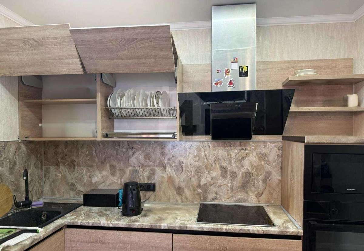 Кухня оборудована всей необходимой бытовой техникой: холодильник, духовка, электрическая плита и микроволновая печь.