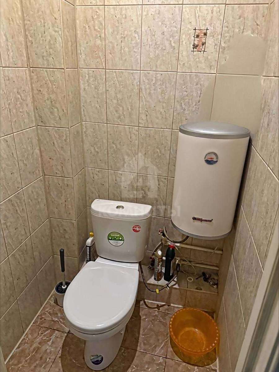 Раздельный санузел отделан светлой плиткой, установлен бойлер.