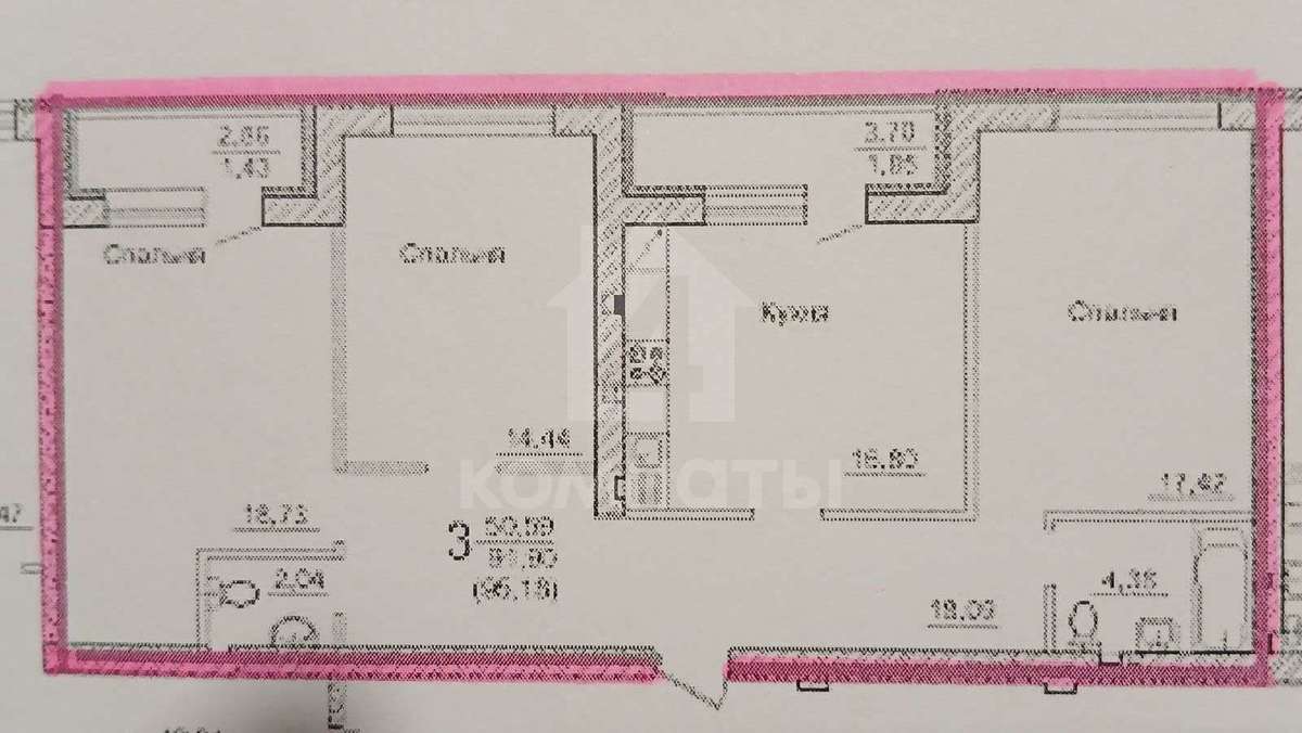 В квартире: три комнаты - 19; 17,5 и 14,5 кв.м.; шикарная кухня квадратной формы - 17 кв.м.; коридор - 18кв.м.; санузел, облицованный современной плиткой, - 4,5 кв.м.; две лоджии 4 и 3 кв.м.
