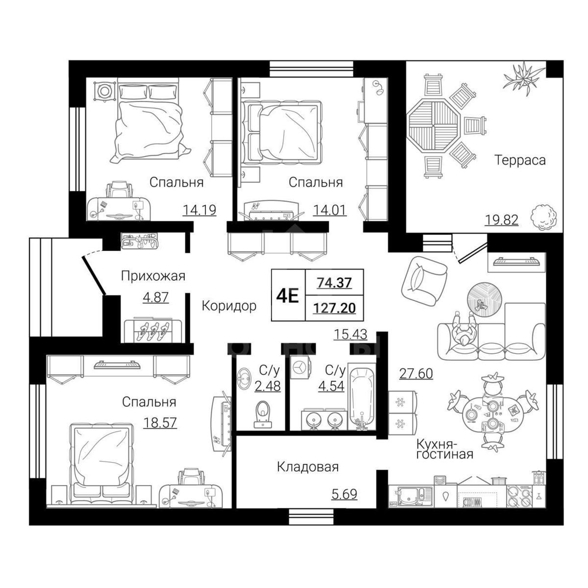 Удобная планировка: кухня- гостиная с выходом на террасу - 27 кв.м, три просторных спальни - 18,6 и по 14 кв.м., раздельный санузел, котельную, террасу - 20 кв.м.,крыльцо - 4 кв.м. .