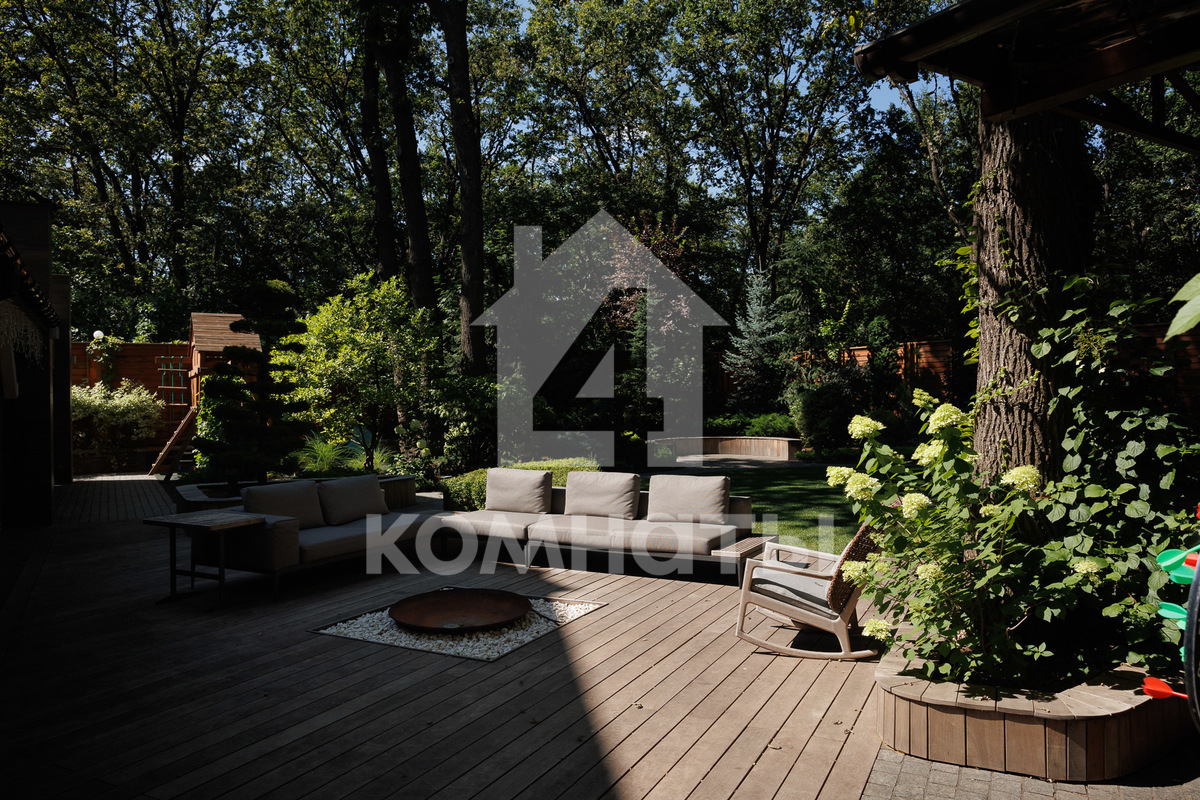 Участок: Ландшафтный сад, патио, зона барбекю (Grillvett, Big Green Egg), детская площадка и домик на дереве.