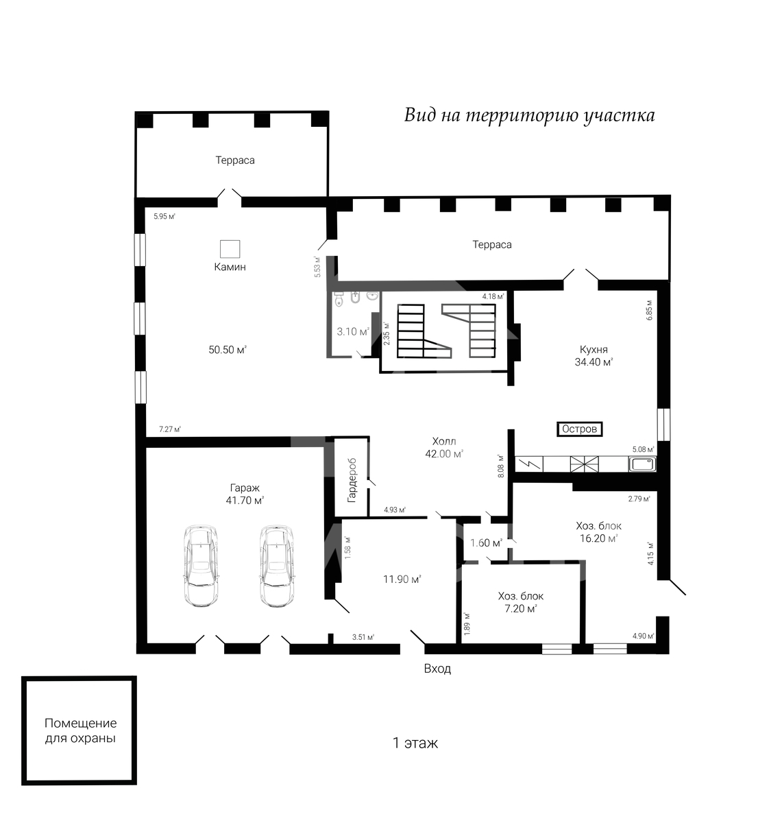 1 этаж с другой стороны - входная группа (42 кв.м), кухня (Boffi, техника Miele, Gaggenau), гостиная с камином (50 кв.м), выход на лаундж-террасу.