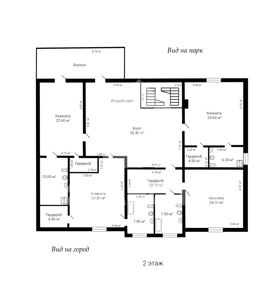 2 этаж: 4 -спальни - с хорошими видовыми характеристиками, каждая имеет свою гардеробную и ванную комнату. Второй свет (потолки 4-8 м), выход на террасу.