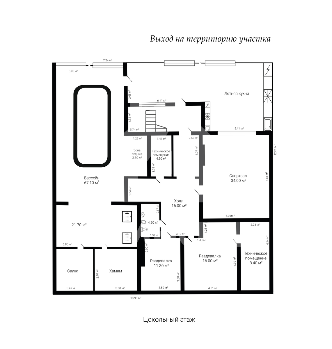 1 этаж с выходом на территорию участка: SPA-зона с бассейном, хамамом, сауной, джакузи и спортзалом; летняя кухня (Leicht, Neff). Потолки 3.6 м.