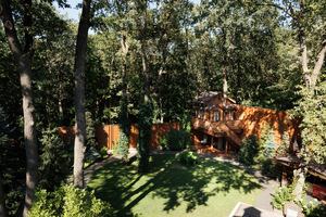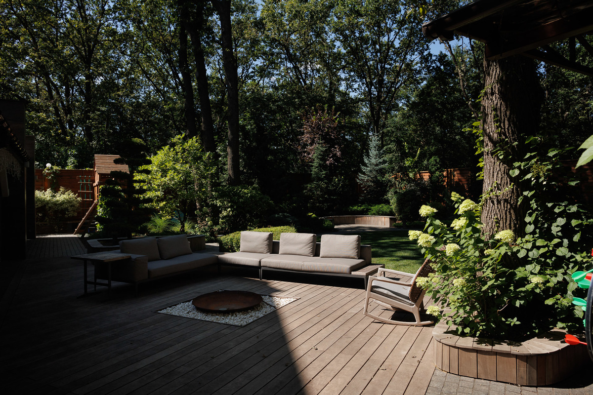 Участок: Ландшафтный сад, патио, зона барбекю (Grillvett, Big Green Egg), детская площадка и домик на дереве.