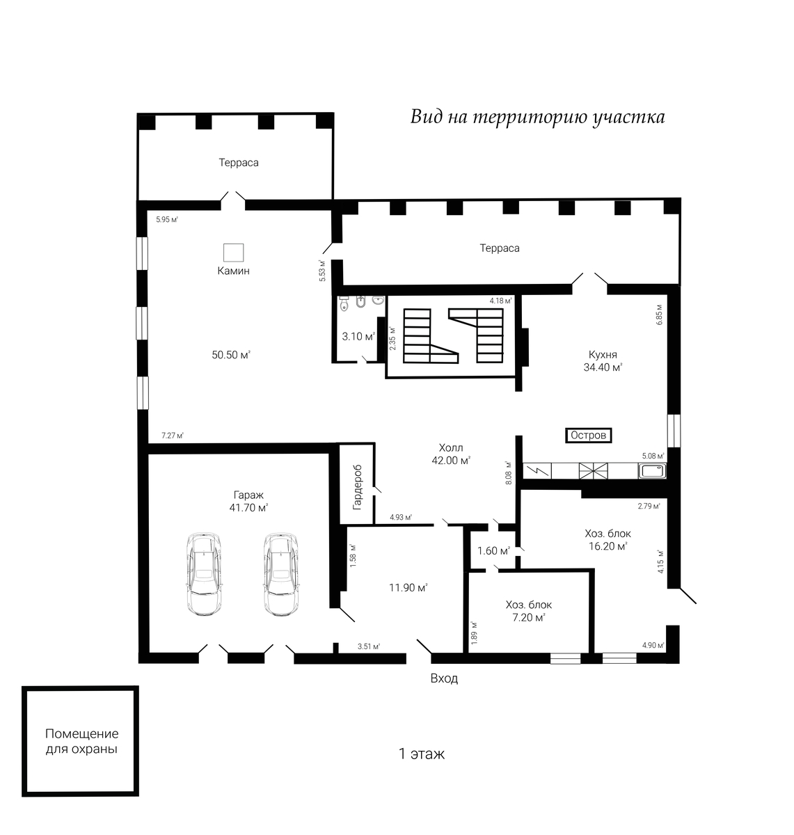 1 этаж с другой стороны - входная группа (42 кв.м), кухня (Boffi, техника Miele, Gaggenau), гостиная с камином (50 кв.м), выход на лаундж-террасу.