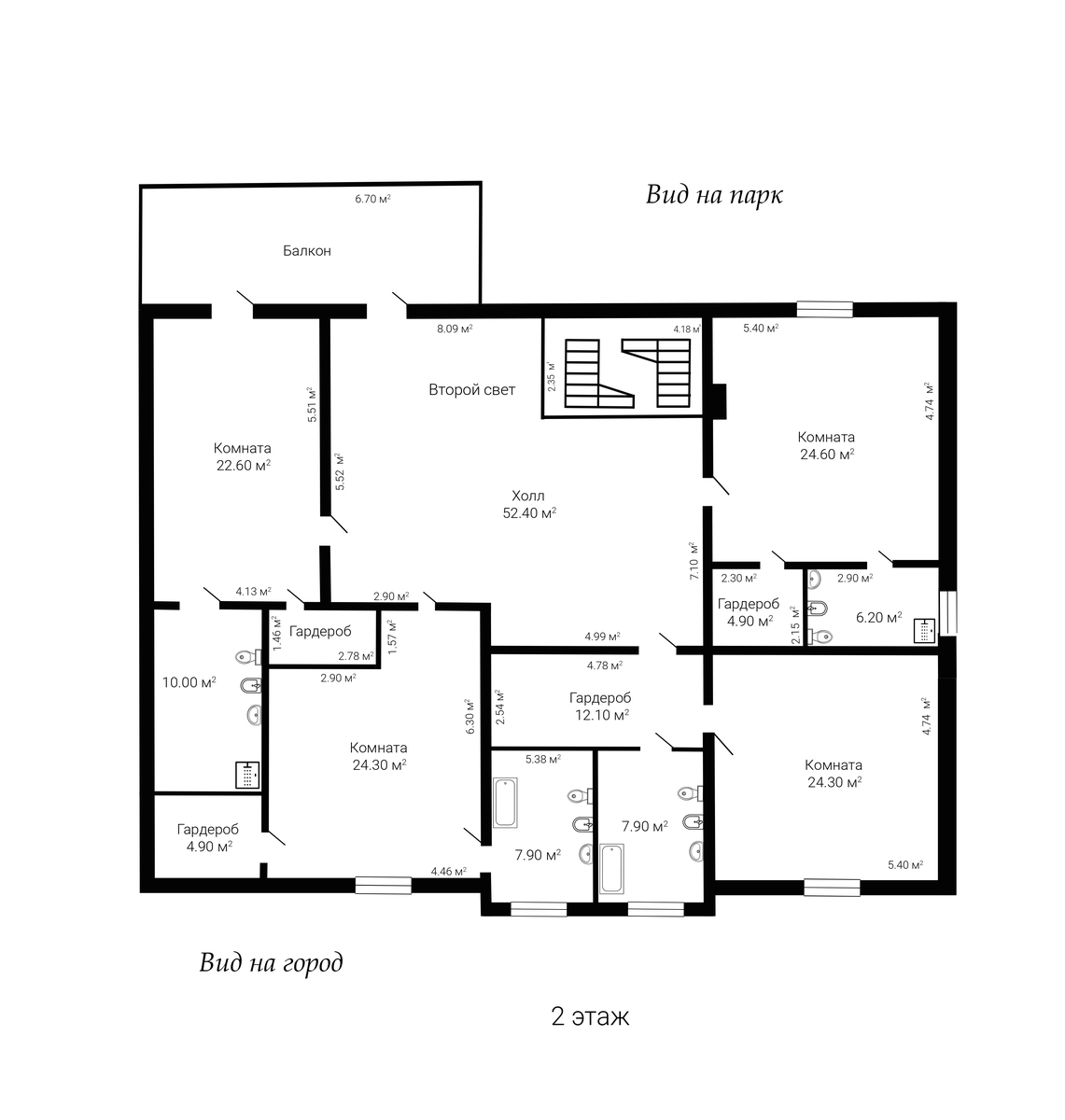 2 этаж: 4 -спальни - с хорошими видовыми характеристиками, каждая имеет свою гардеробную и ванную комнату. Второй свет (потолки 4-8 м), выход на террасу.